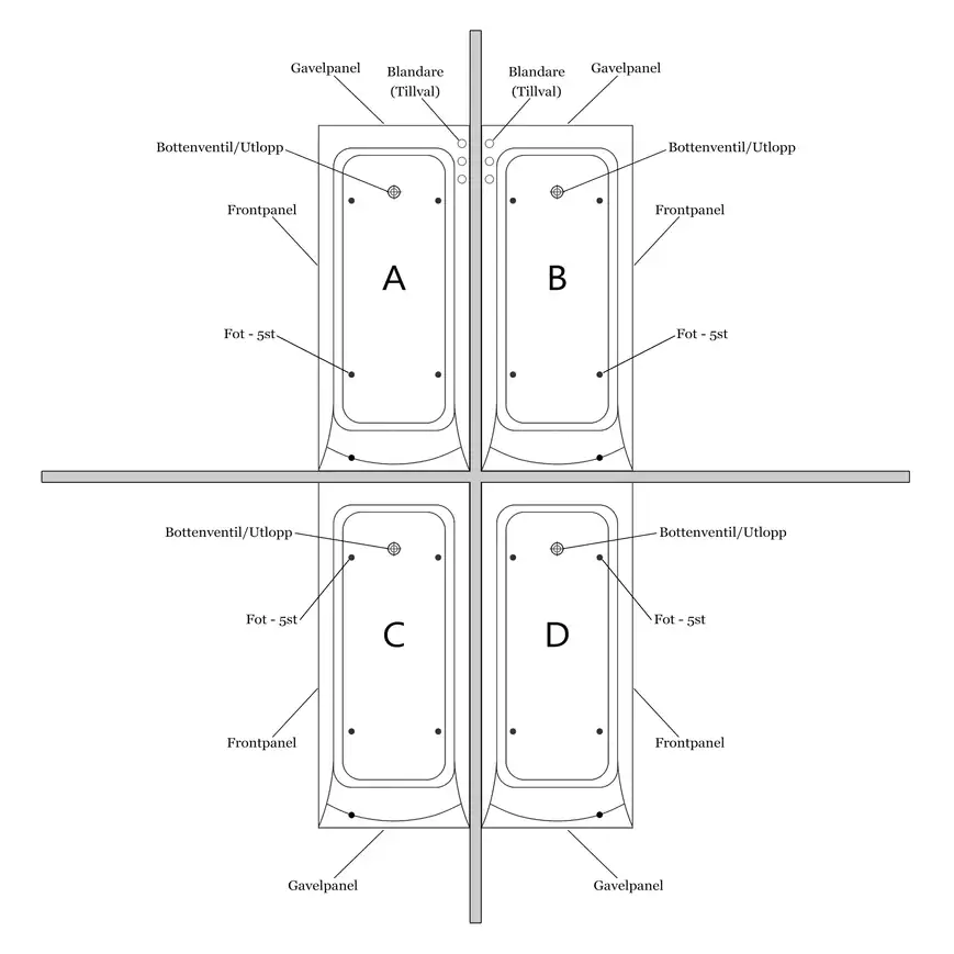 Vakiovarusteet: Etupaneeli, tukeva jalkasarja ja pohjaventtiili sisältyvät toimitukseen.
