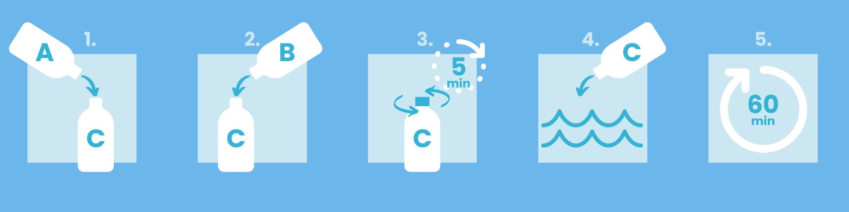 - Ei tarvitse toimiakseen erillistä allasklooria tai tehosteainetta: Vain sekoittamalla kahta ainetta 50 ml ja 50 ml sekoituspulloon, muuta ei tarvita.